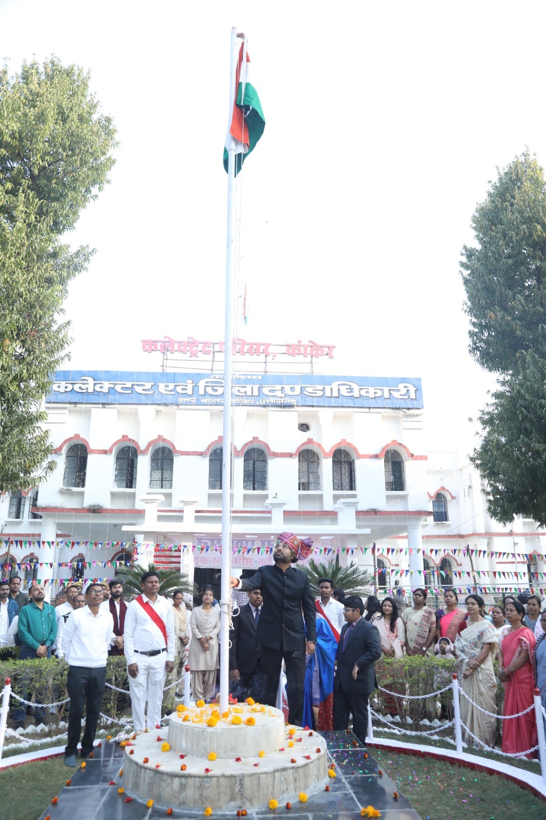 77वें गणतंत्र दिवस के अवसर पर कलेक्टर निलेशकुमार महादेव क्षीरसागर ने जिला कार्यालय परिसर कांकेर में सुबह 08 बजे राष्ट्रध्वज फहराया। राष्ट्रगान एवं राष्ट्रगीत वंदे मातरम का गायन के बाद उन्होंने उपस्थित सभी अधिकारी-कर्मचारियों को गणतंत्र दिवस की बधाई एवं शुभकामनाएं दी। सभी अधिकारी-कर्मचारियों को निष्ठापूर्वक एवं ईमानदारी के साथ उत्तरदायित्वों का निर्वहन करते हुए सौंपे गये दायित्वों को पूर्ण करने के लिए प्रोत्साहित किया। जिला कार्यालय में ध्वजारोहण के पहले कलेक्टर निवास में भी ध्वजारोहण कर राष्ट्रगान एवं राष्ट्रगीत वंदेमातरम का गायन हुआ। इस मौके पर राज्य प्रशासनिक सेवा के सभी अधिकारी एवं कर्मचारीगण मौजूद थे।
