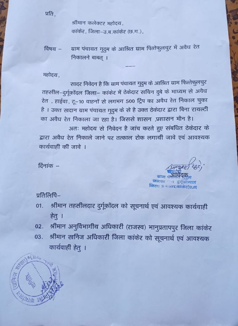 ताजा मामला दुर्गूकोंदल ब्लाक के ग्राम पंचायत गुदुम के आश्रित ग्राम फित्तेफुलचुर तहसील-दुर्गकोंदल जिला कांकेर का है जहां ग्रामीणों ने लिखित शिकायत में जिला कलेक्टर के नाम ज्ञापन सौंपकर बताया है कि ठेकेदार सचिन दुबे के माध्यम से अवैध रेत, हाईवा, टू-10 वाहनों से लगभग 500 ट्रिप का अवैध रेत निकाल चुका है । उक्त खदान ग्राम पंचायत गुदुम से है उक्त ठेकेदार द्वारा बिना रायल्टी का अवैध रेत निकाला जा रहा है। जिससे शासन प्रशासन मौन है।