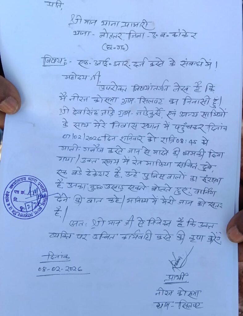 सरपंच बंसती भालेश्वर ने अपने शिकायत में कहा है कि मैं बंसती भालेश्वर सरपंच ग्राम पंचायत लोहात्तर का निवासी हूँ। कल दिनांक 07/02/2028 दिन शनिवार रात्रि 9 बजे मेरे निवास स्थान (घर) में ही देवसिंह जाडे ग्राम जोड़कुर्से निवासी के साथ अन्य 15-20 साथियों के साथ पहुंचकर दरवाजा खटखटाते हुए हुए बाहर निकलने के लिए बोला गया जिस पर दरवाजा खोलते हुए बाहर निकली। उसके बाद देवसिंह जाड़े द्वारा रेत परिवहन संबंधित प्रदर्शन में शामिल होने से मना करते हुए, गाली गलौज करते हुए जान से मारने की धमकी दिया गया।